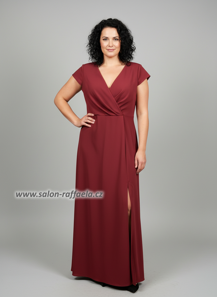 Dlouhé společenské šaty jednoduchého střihu s rozparkem a krátkým rukávem