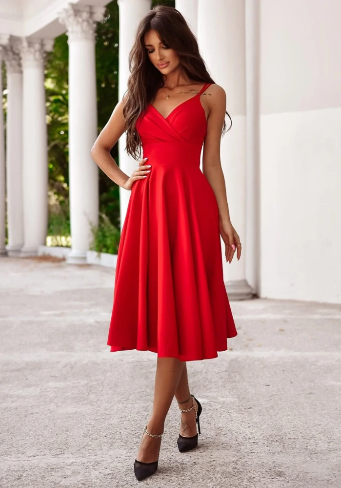 Červené jednoduché šaty na ramínka. 7/8 délka.