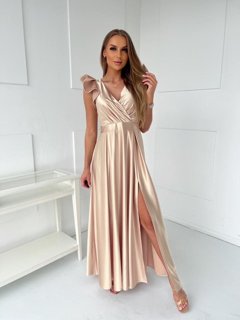 Zlaté/bronzové saténové dlouhé společenské šaty s motýlkovými rukávky