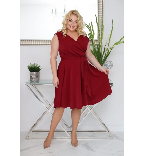 Krátké vínové společenské šaty s přeloženým dekoltem a s páskem