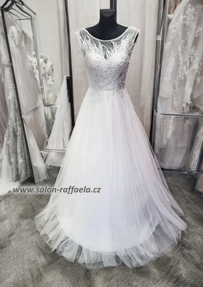 Tylové svatební šaty s holými zády a třpytivým topem ke krku