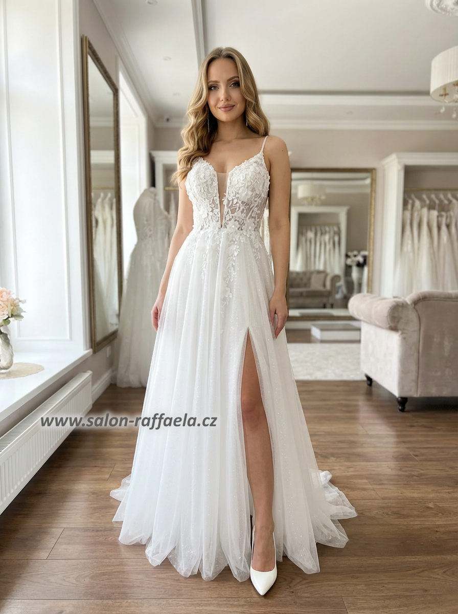 Svatební šaty Siderno s dvojitými ramínky a 3D aplikacemi (vel. 38)
